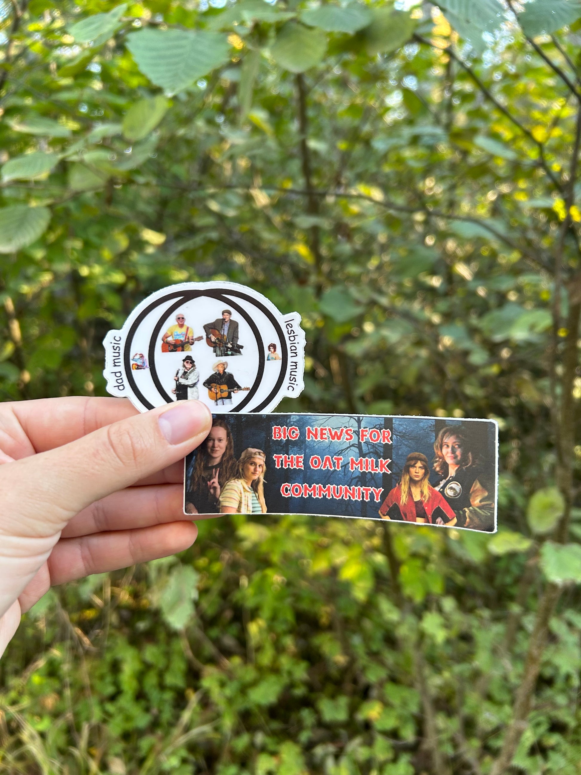 Imagine a sticker featuring the words "Big For The Oat Milk Community" in bold, playful lettering, surrounded by the beloved cast of the queer characters from Yellowjackets.