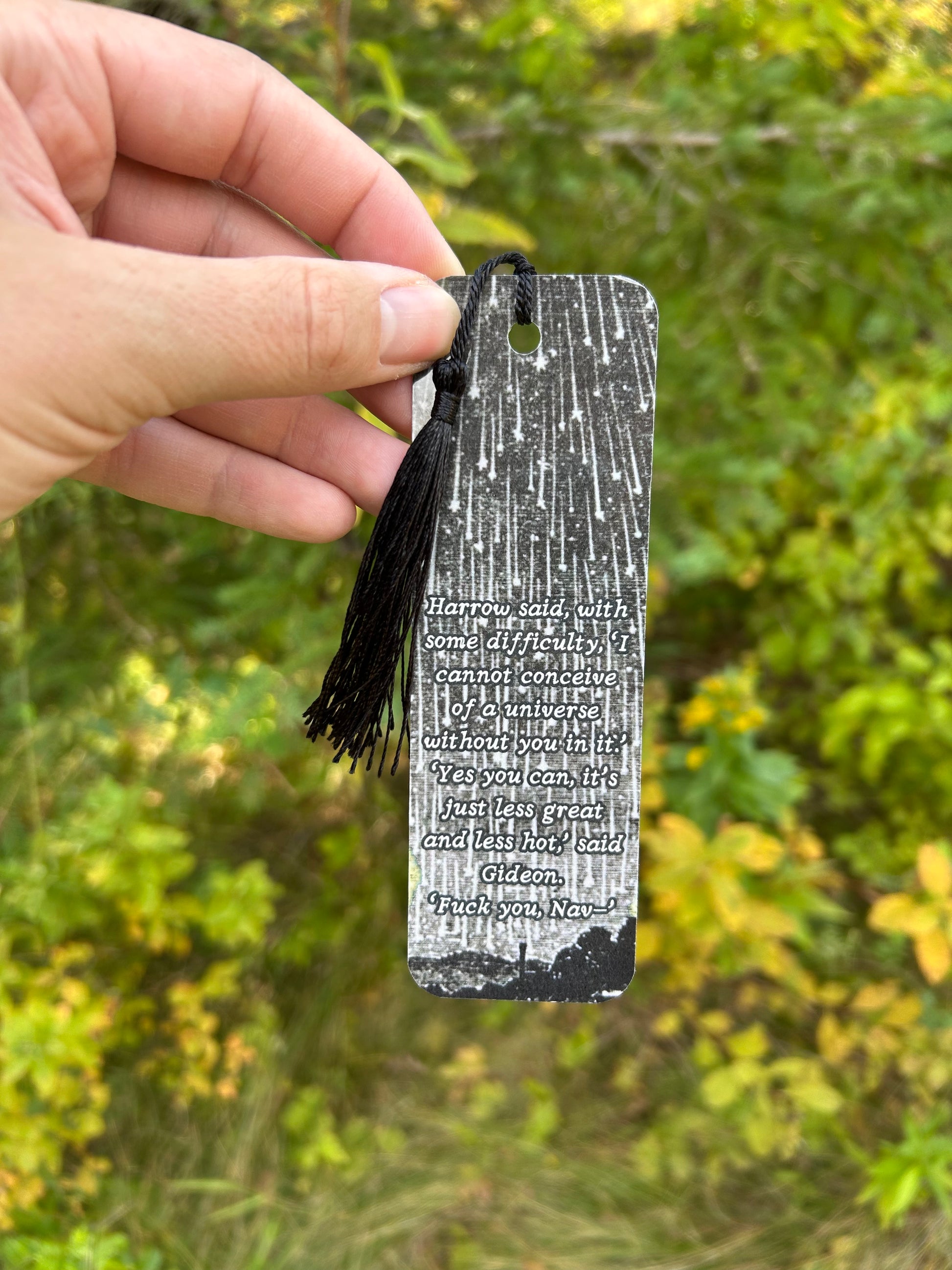 Kick your little feet with the witty banter of The Locked Tomb series. Featuring a meteor shower and a poignant quote from Gideon and Harrow, this bookmark is the perfect accessory for any fan.