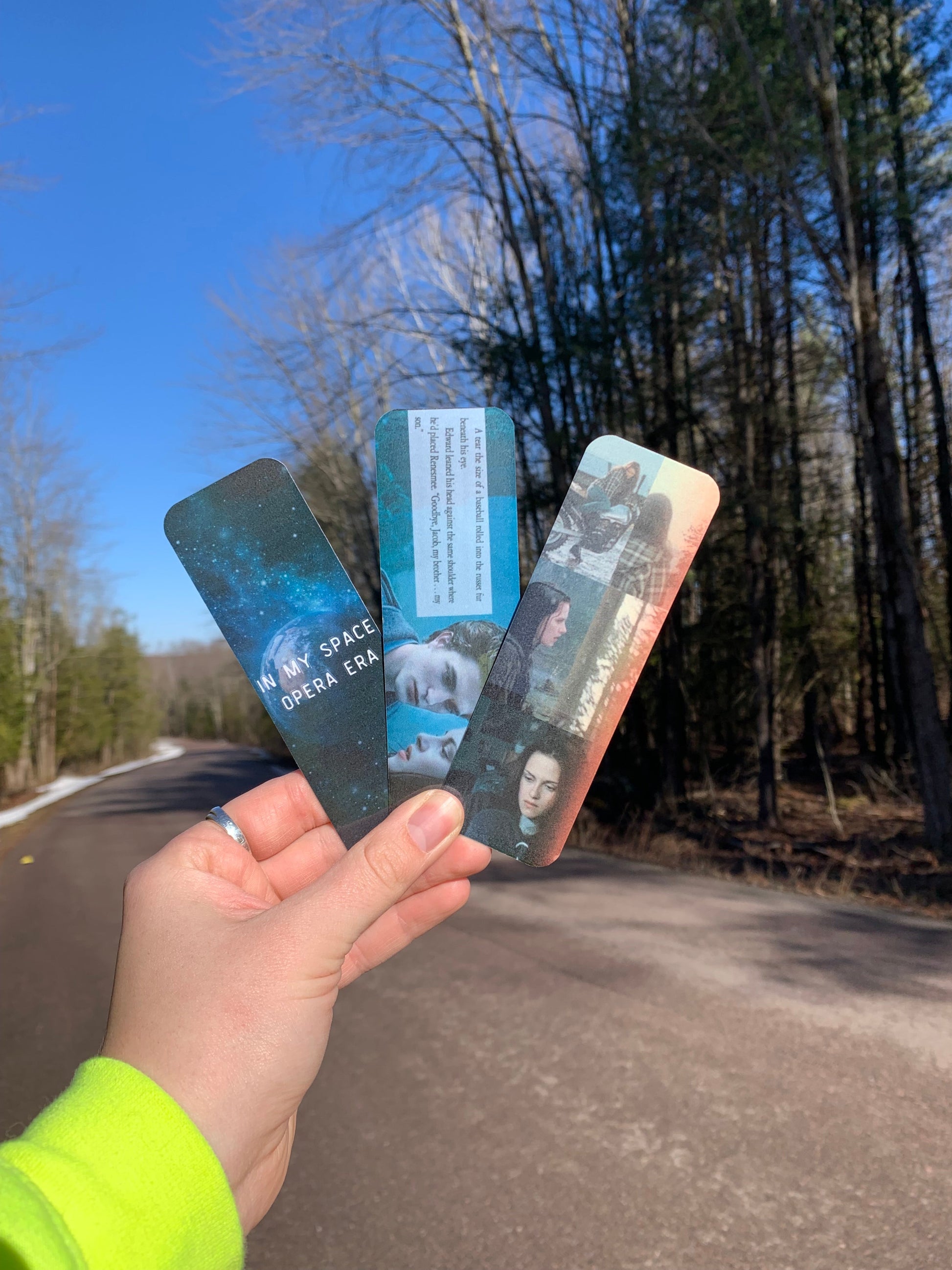 Our bookmarks are designed and made in-house by Sierra. She uses card stock, lamination papers, and a corner rounder to make the bookmarks the best quality that they can be. It’s up to you whether or not you would like a tassel. The bookmarks are hand-cut, so they end up being about 6” by 1.5”.