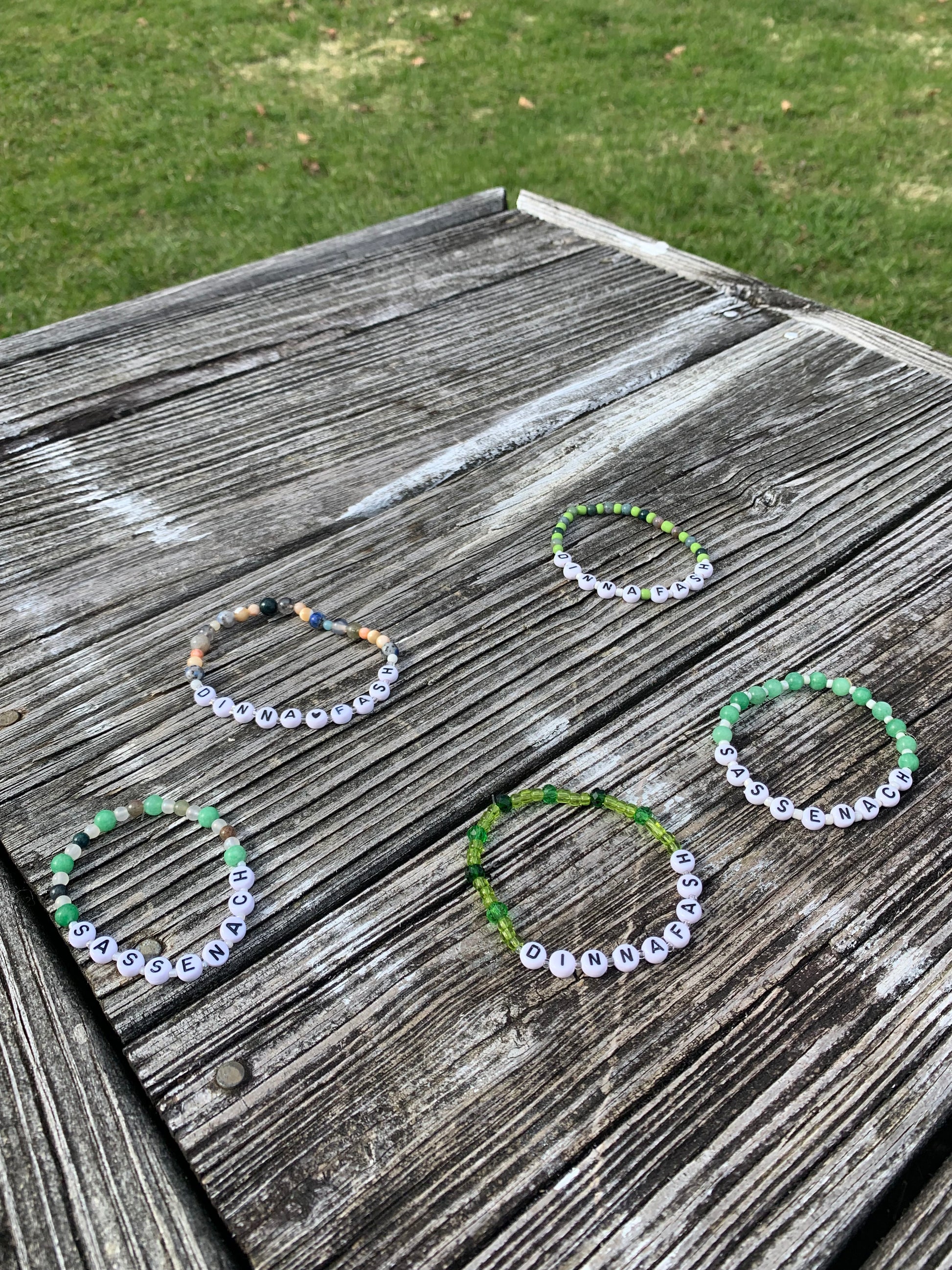 Our bracelets are made with a combination of new and thrifted beads. Because of this, each bracelet is completely unique. Your bracelet might not look exactly like a bracelet pictured. All bracelets use brand-new string from the craft store.