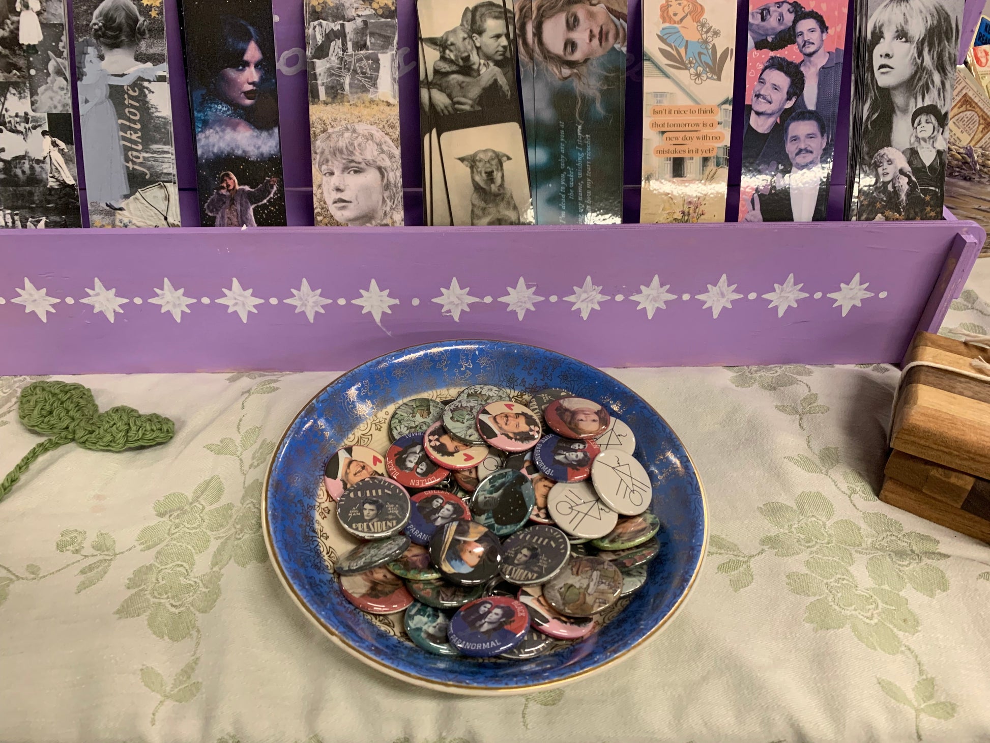 Our pins are made of metal, paper, and plastic.