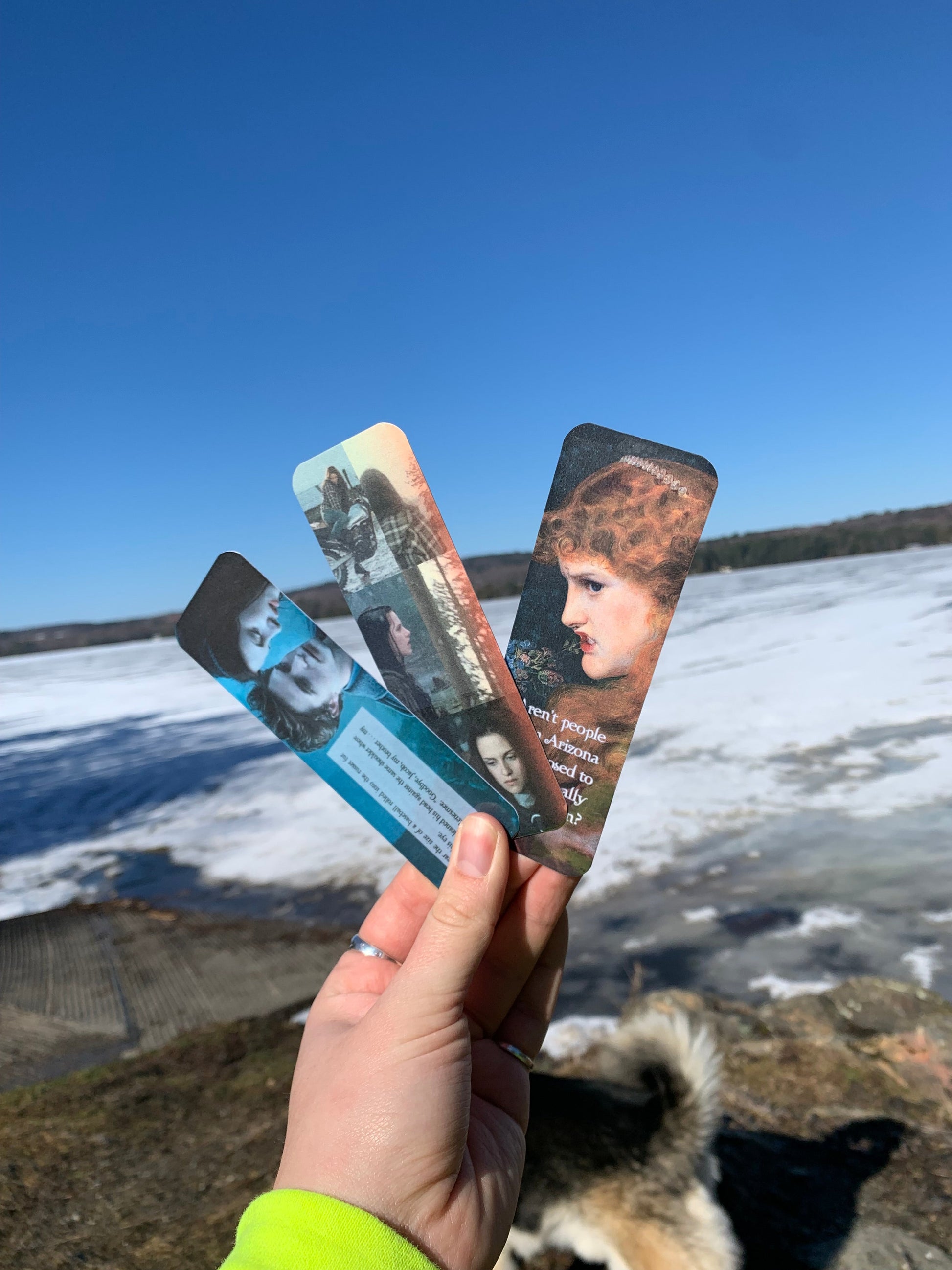 Our bookmarks are designed and made in-house by Sierra. She uses card stock, lamination papers, and a corner rounder to make the bookmarks the best quality that they can be. It’s up to you whether or not you would like a tassel. The bookmarks are hand-cut, so they end up being about 6” by 1.5”.